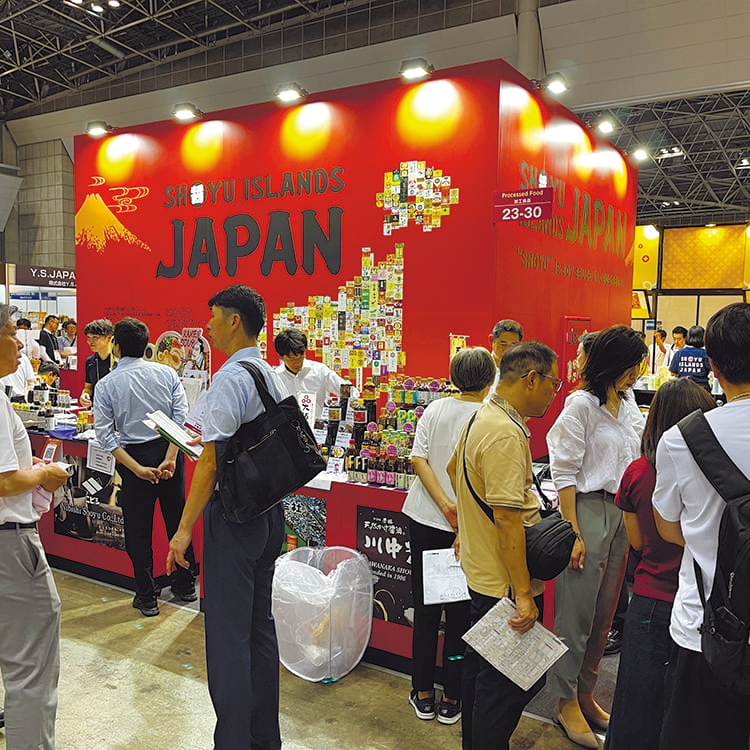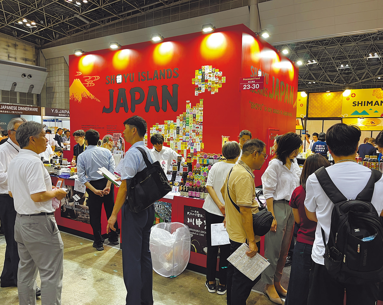 Attendees mill about the booth of the National Federation of Soy Sauce Manufacturers Cooperatives at the Foodex Japan convention in March.