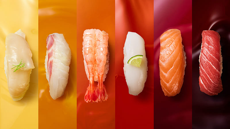 In other words, each piece of sushi pairs best with a certain type of sauce, from the light ones on the far left to the dark ones on the far right. Takahashi continued: