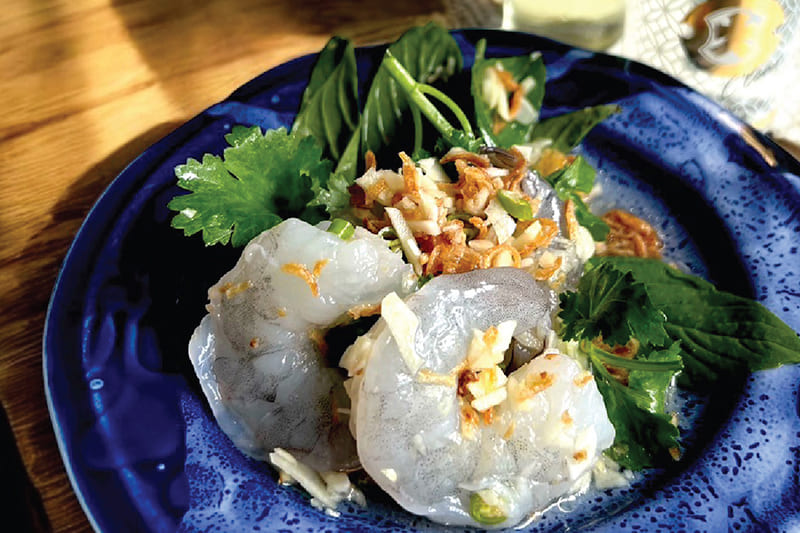 This dish sees deveined and cleaned shrimp on a plate topped with a vibrant dressing of lime juice, bird’s eye chili, garlic, clear soy sauce and wasabi oil. Garnished with crispy shallots and fresh herbs, it achieves a perfect balance of heat, acidity and umami without overpowering the shrimp. It can be served chilled for a lively start to any meal.