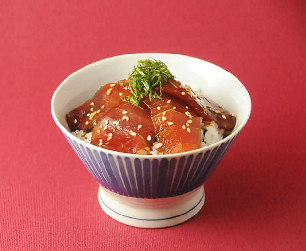 For this dish, mirin and sake are briefly brought to a boil to reduce the alcohol, then seasoned with koikuchi shoyu. Once cooled, slices of sashimi-grade tuna or salmon (if tuna is unavailable) are marinated in the sauce.