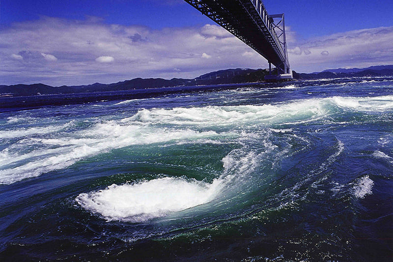 Take the Naruto Whirlpools, for example. Found off the coast between Shikoku and Awaji Island, where the Seto Inland Sea collides with the Pacific, the Naruto Strait boils with one of the world’s fastest and strongest tidal currents, producing a ferocious ocean roar. But a closer look reveals the beauty hidden within the massive vortexes, making them seem more like a frenzied dance of nature.