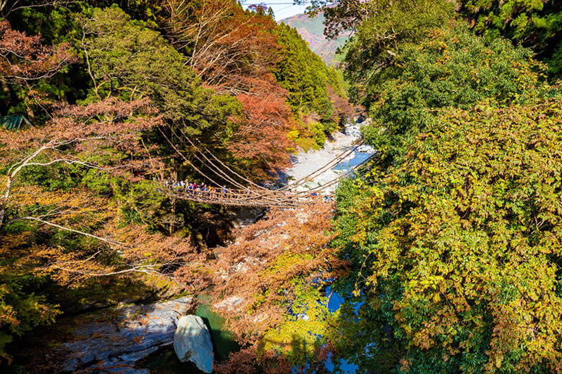 On the other side of the prefecture, another marvel attracts travelers looking for a little adventure. Deep in the mysterious Iya Valley stretches the Iya Kazurabashi (Vine Bridge of Iya), a National Important Tangible Folk Cultural Property and one of Japan’s three most interesting bridges. Some 14 meters above the emerald waters of the Iya River, this 45-meter-long, 2-meter-wide suspension bridge is woven entirely from hardy local vines, weighing close to six tons. Every step on the swaying structure, built sometime between the ninth and 12th centuries, is a thrill combined with a test of confidence in the craftsmanship of ancient Japanese engineers.